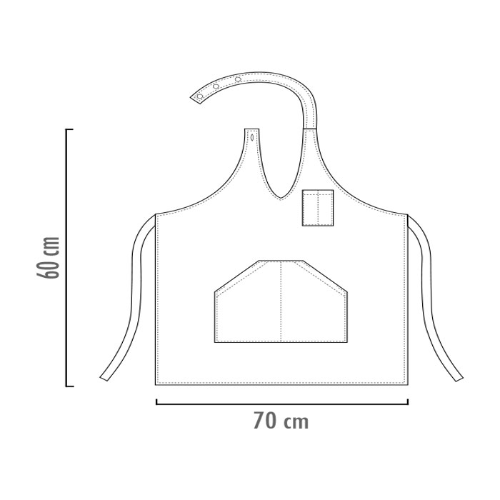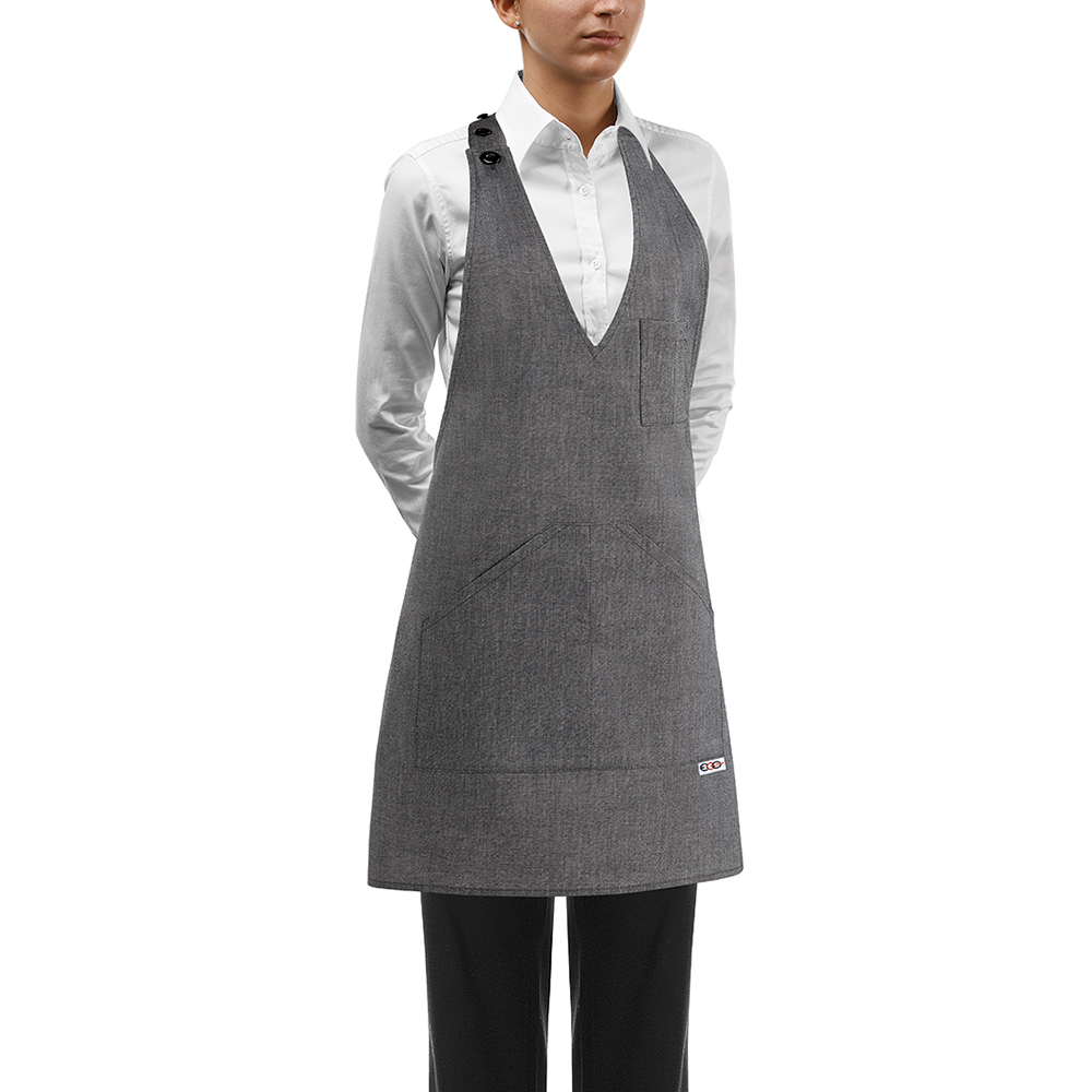 Short sommelier apron with neck adjustment, pocket and pen pocket.